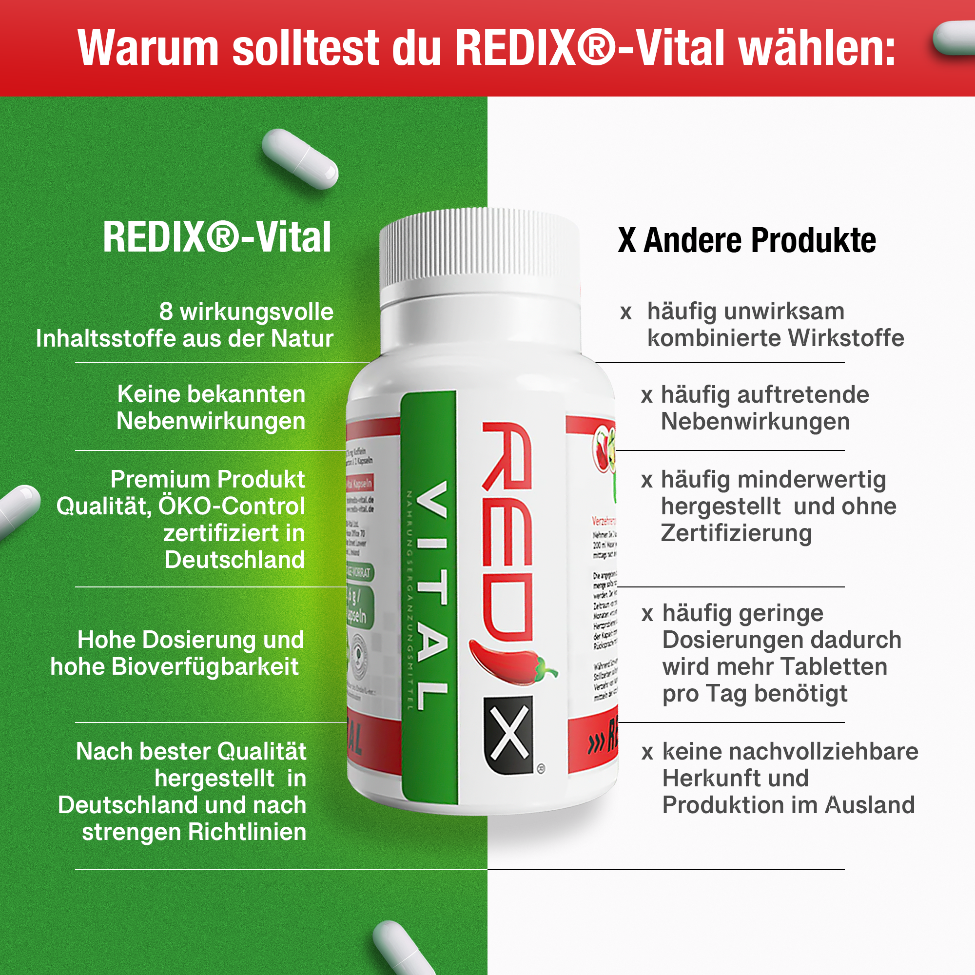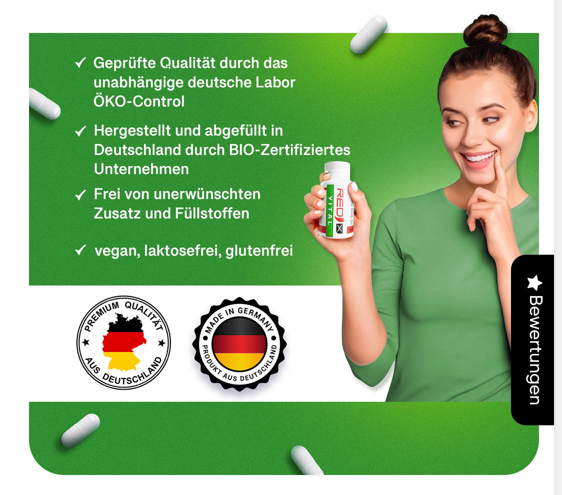 REDIX®-Vital – von Diätexperten empfohlen und dein treuer Begleiter auf dem Weg zur erfolgreichen Gewichtsreduktion. Mit seiner effektiven Formel liefert es dir optimale Ergebnisse, während es für höchste Qualität und Nachhaltigkeit aus deutscher Produktion steht.