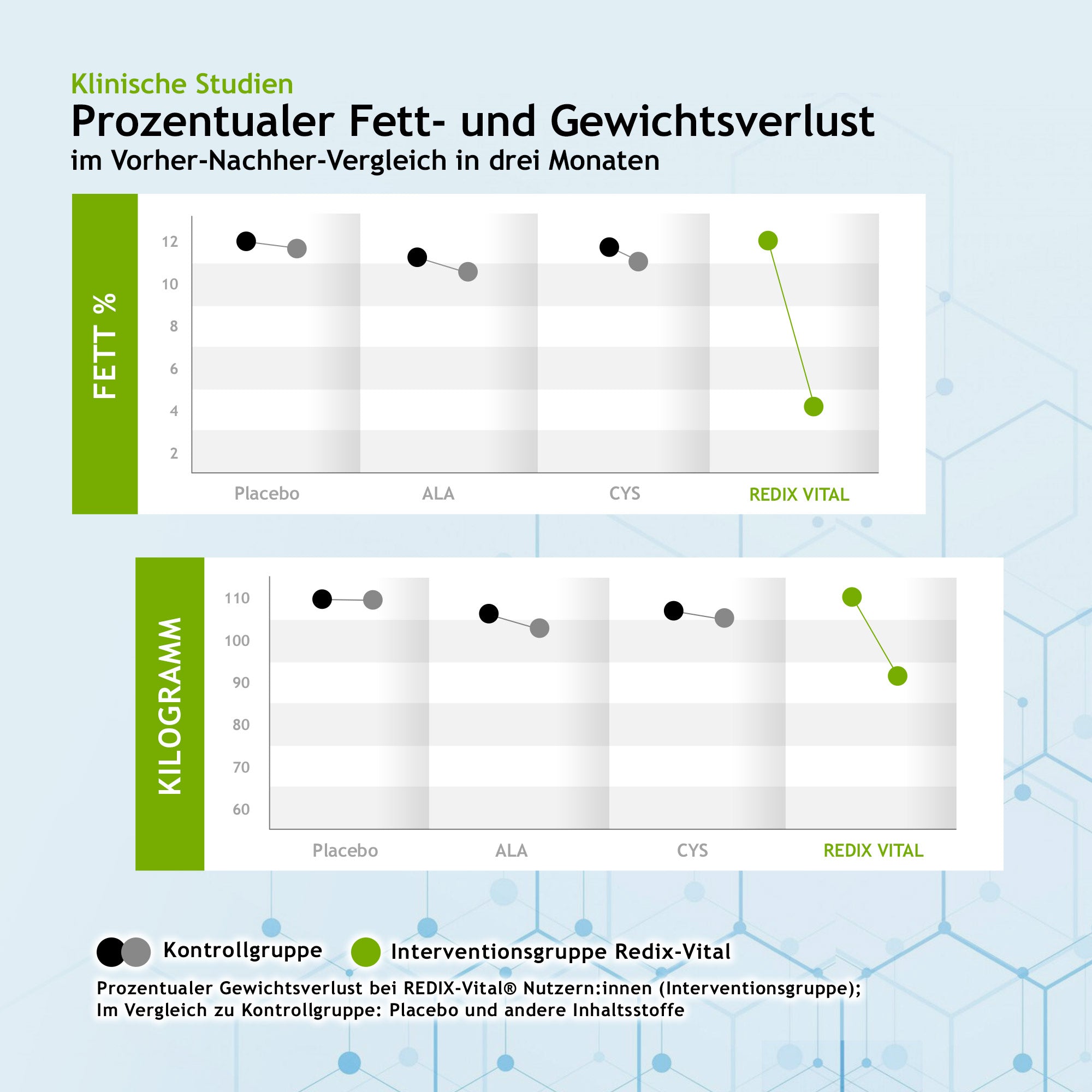 Klinische Studien bestätigen REDIX®-Vital als Testsieger dank seiner effektiven 8-Fach-Formel, die sowohl beim Gewichtsverlust als auch bei der Verringerung des Körperfettanteils überzeugt. Im Vergleich zu Placebos und anderen Produkten erzielte es herausragende Ergebnisse, mit sichtbaren Erfolgen bereits in den ersten drei Monaten.